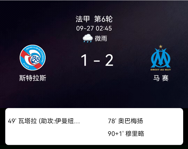 北京时间9月27日法国足球甲级联赛(法甲)第6轮,斯特拉斯堡坐镇主场迎战马赛。主队下半场先拔头筹,马赛随后扳平比分,并在补时阶段完成绝杀,最终客场逆转取胜,最终比分,斯特拉斯堡1-2马赛。