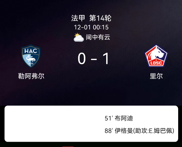北京时间12月1日,法国足球甲级联赛第14轮,勒阿弗尔主场对阵里尔。第38分钟勒阿弗尔染黄;第51分钟阿尤布-布阿迪直红;第88分钟伊加马内破门,0-1;共1张黄牌1张红牌。最终比分,勒阿弗尔0-1里尔。