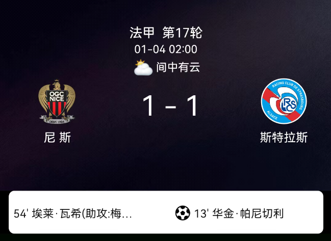 北京时间1月4日03:00,2025-2026赛季法国足球甲级联赛第17轮,尼斯主场对阵斯特拉斯堡。第13分钟帕尼切利点球破门,0-1;第54分钟瓦希破门,1-1;双方无红黄牌。最终比分,尼斯1-1斯特拉斯堡。