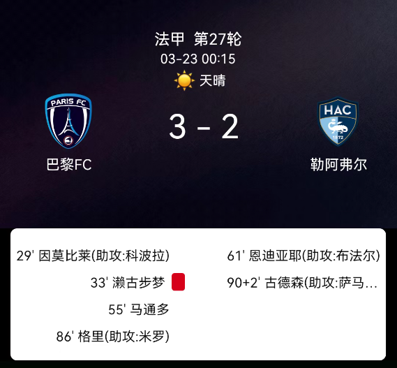 北京时间3月23日02:09,法国足球甲级联赛第27轮,巴黎fc主场迎战勒阿弗尔。上半场巴黎fc攻势凌厉,第29分钟科波拉助攻因莫比莱率先破门,4分钟后濑古步梦不慎自摆乌龙,巴黎fc迅速取得两球优势。下半场第55分钟吕迪-马通多染红,巴黎fc被迫以十人应战。第61分钟恩迪亚耶为勒阿弗尔扳回一城,第86分钟里斯-米卢助攻戈里再度扩大比分。补时阶段基耶雷梅为客队再入一球,但无力回天。最终巴黎fc主场3-2击败勒阿弗尔。