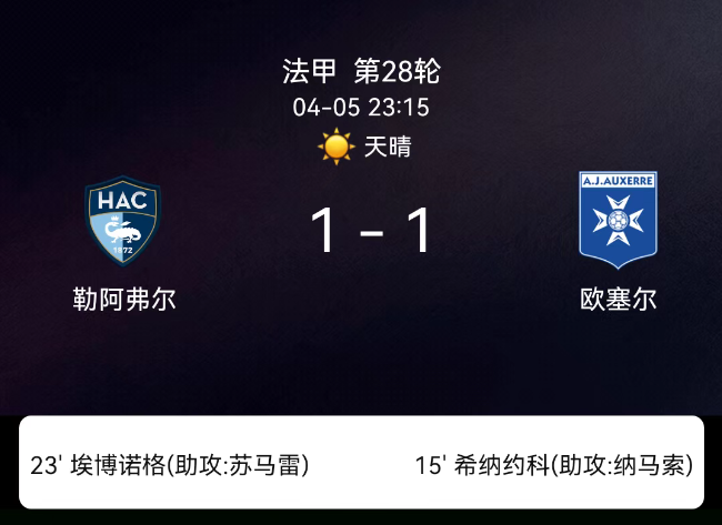 第23分钟伊博诺格门前抢点得分,勒阿弗尔迅速扳平比分