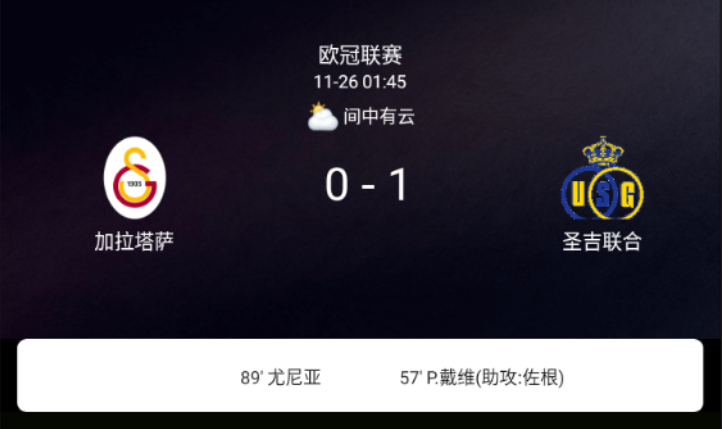 北京时间11月26日,欧洲冠军联赛联赛阶段第5轮,加拉塔萨雷主场迎战圣吉罗斯联合。第57分钟普罗米斯-戴维破门,0-1;第90分钟云亚伊两黄变一红被罚下;双方各1张黄牌。最终比分,加拉塔萨雷0-1圣吉罗斯联合。