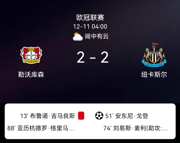 北京时间12月11日4:00,2025赛季欧冠联赛第6轮,勒沃库森主场迎战纽卡斯尔联。第13分钟吉马良斯乌龙,1-0;第51分钟戈登点射,1-1;第74分钟米利破门,1-2;第88分钟格里马尔多破门,2-2;勒沃库森1黄、纽卡无红黄牌。最终比分,勒沃库森2-2纽卡斯尔联。