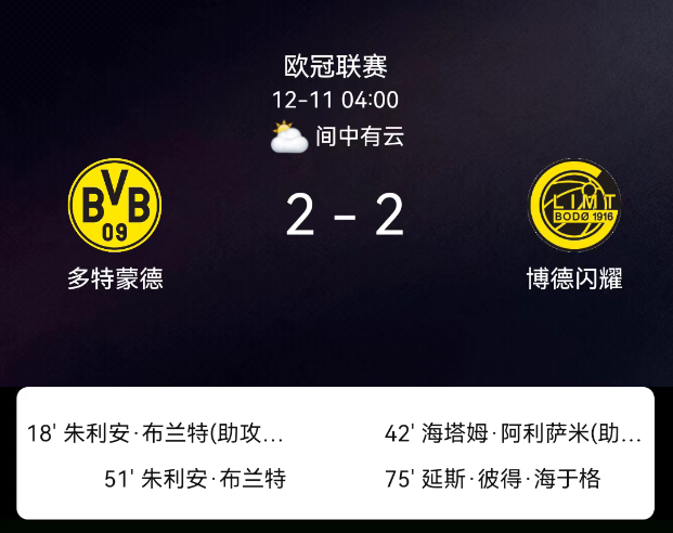 北京时间12月11日4:00,2025赛季欧冠联赛第6轮,多特蒙德主场迎战博德闪耀。第18分钟布兰特破门,1-0;第42分钟阿里萨米破门,1-1;第51分钟布兰特双响,2-1;第75分钟海于格破门,2-2;多特1黄、博德闪耀无红黄牌。最终比分,多特蒙德2-2博德闪耀。