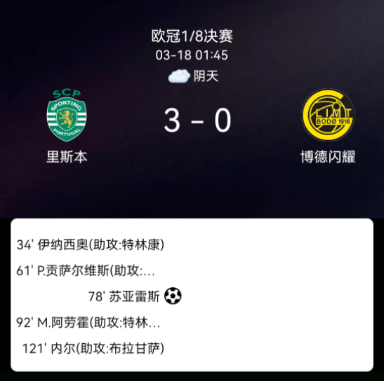 北京时间3月18日04:24,欧冠1/8决赛次回合,里斯本竞技主场迎战博德闪耀。首回合落后的里斯本竞技展开强势反扑,第34分钟贡萨洛-伊纳西奥头球破门,下半场第61分钟佩德罗-贡萨尔维斯抢点再下一城,第77分钟路易斯-苏亚雷斯点球命中将总比分扳平,比赛进入加时。加时第2分钟马克西-阿劳霍破门完成反超,第120分钟拉斐尔-内尔劲射锁定胜局。里斯本竞技单场5-0大胜,两回合总比分5-3上演惊天逆转,成功晋级欧冠八强。