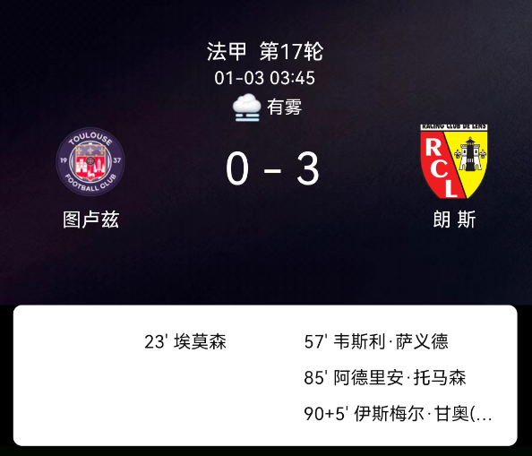 北京时间1月3日03:45,2025-2026赛季法国足球甲级联赛第17轮,图卢兹主场对阵朗斯。第23分钟埃默松染红;第57分钟韦斯利-赛义德破门,0-1;第85分钟阿德里安-托马森破门,0-2;下半场补时第5分钟加尼乌破门,0-3;图卢兹1红2黄、朗斯3黄,无红牌。最终比分,图卢兹0-3朗斯。