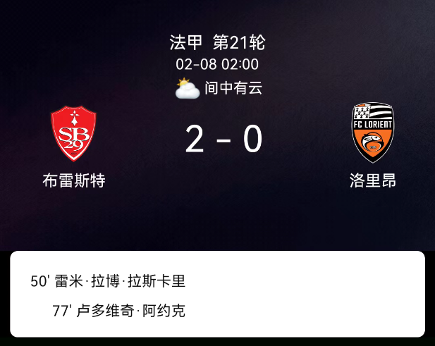 北京时间2月8日法甲第21轮,布雷斯特对阵洛里昂。第50分钟拉斯卡里破门1-0;第77分钟阿若克破门2-0;双方无红黄牌。最终比分,布雷斯特2-0洛里昂。