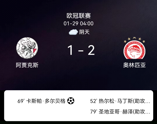 北京时间1月29日,欧冠联赛阶段第8轮,阿贾克斯主场对阵奥林匹亚科斯。第52分钟马丁斯破门0-1;第69分钟多尔贝格点射1-1;第79分钟埃泽破门1-2;双方无红黄牌。最终比分,阿贾克斯1-2奥林匹亚科斯。